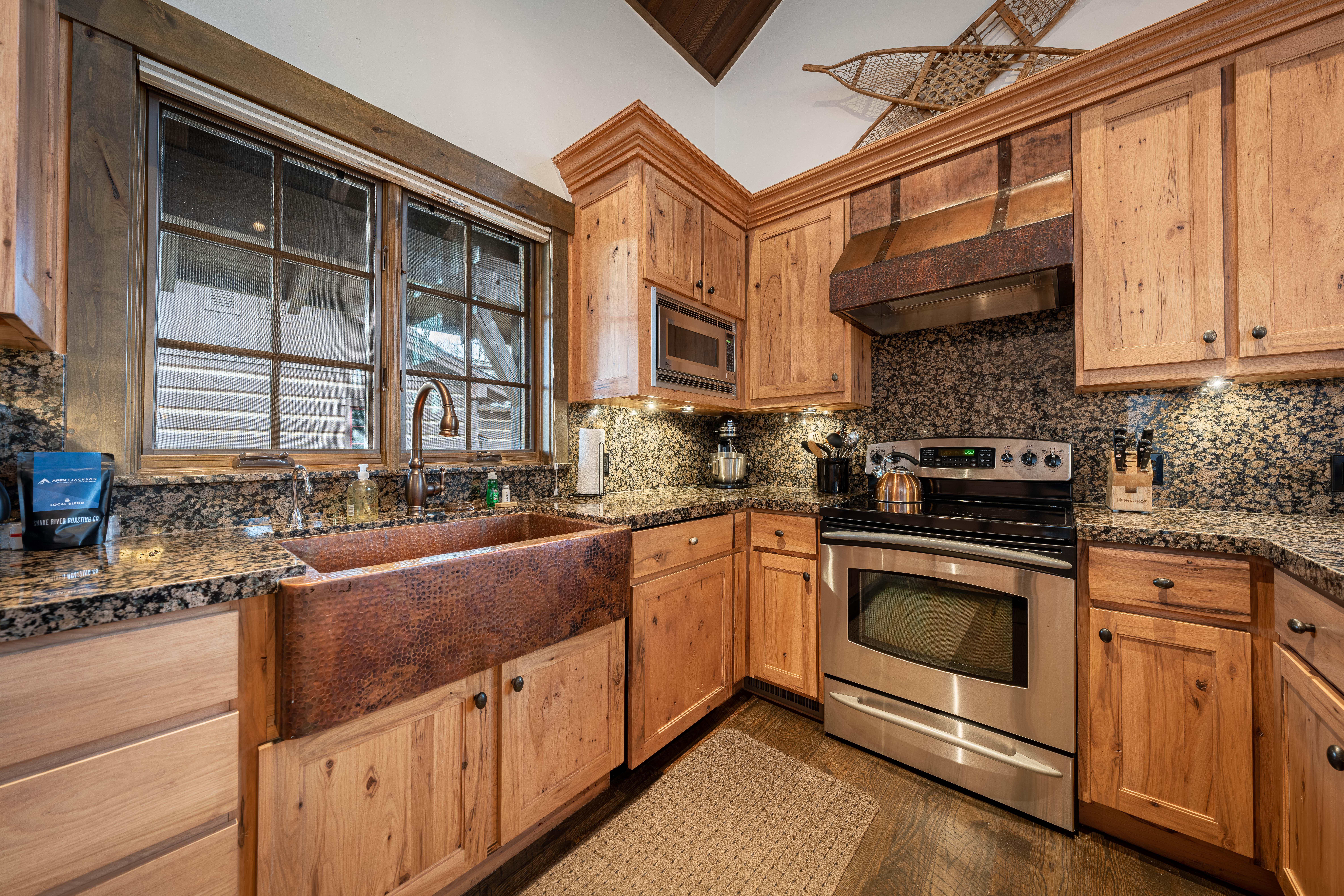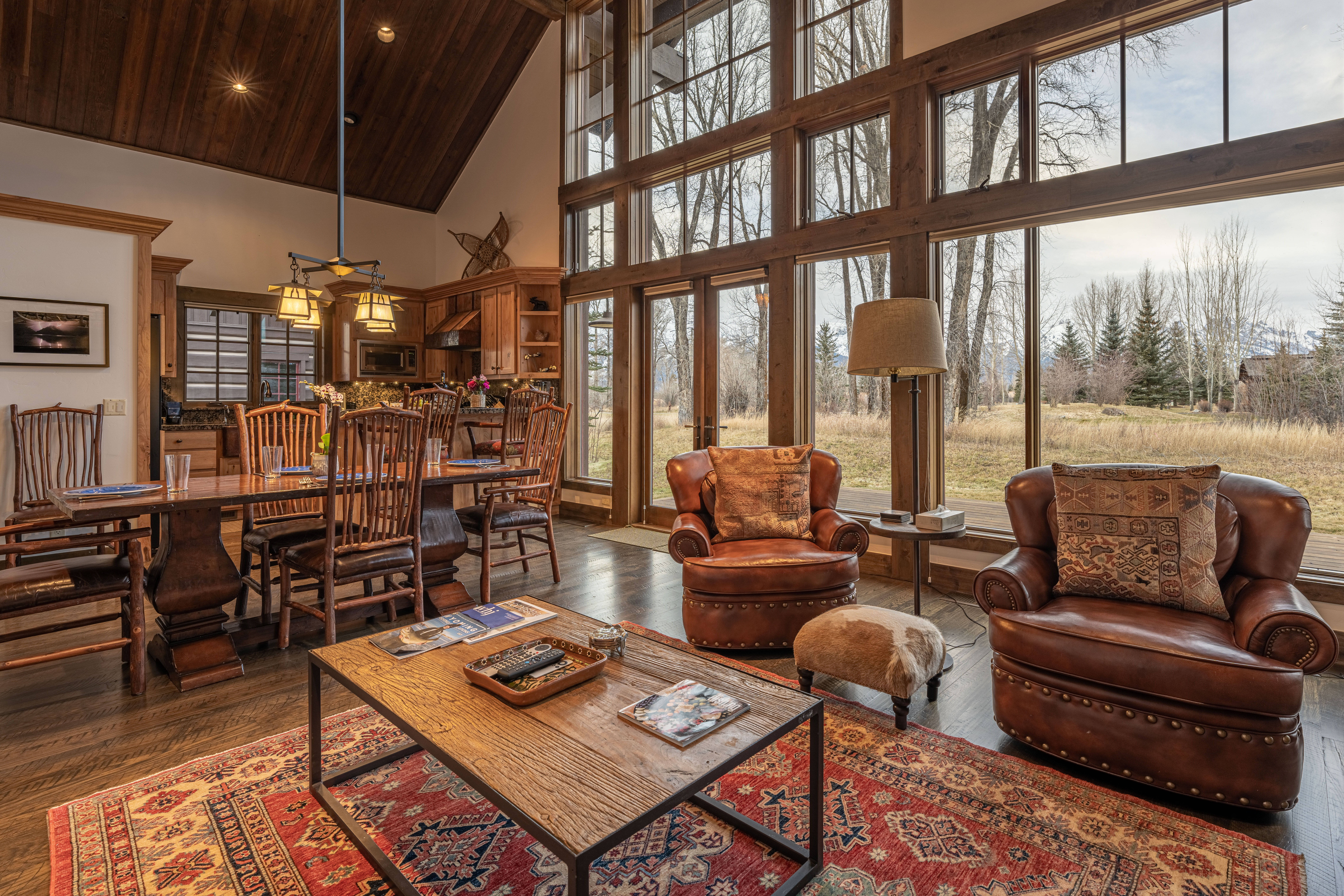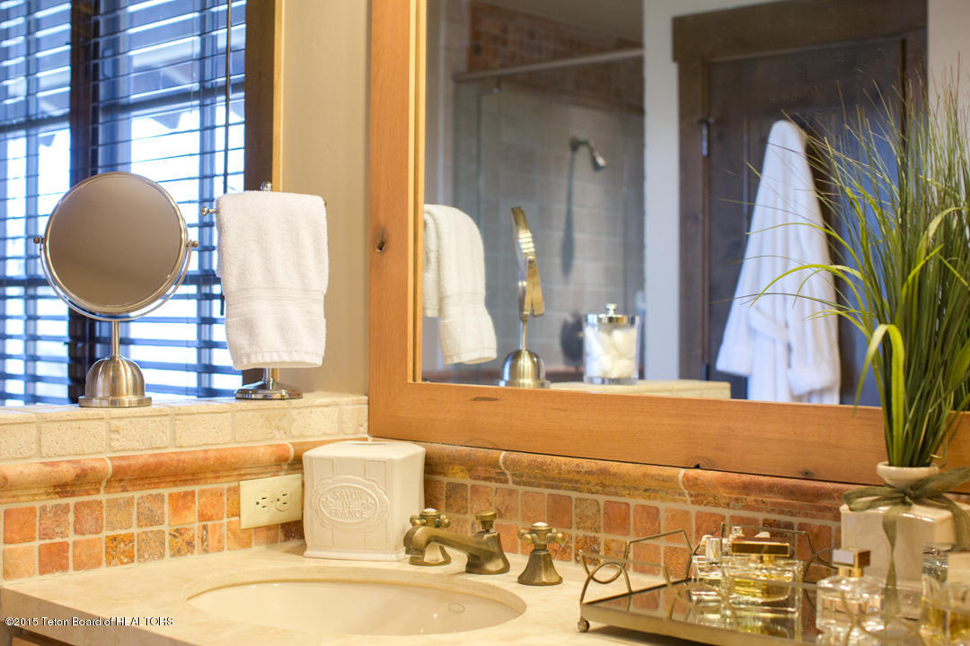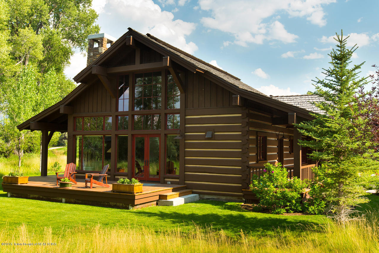This front line cabin at JHG&T Club is a sought after gem due to its location and views. Its vaulted ceilings and expansive windows capture filtered Teton views. Three separate decks offer options for outdoor relaxation with a seasonal spring flowing nearby. Beautifully appointed to blend with its mountain setting. JHG&T Club is semi-private with spectacular scenery, and offers golf, tennis, pool, fitness, year-round dining, and groomed winter Nordic trails. A cozy 2 bed 3 bath cabin surrounded by mature landscaping and gorgeous cottonwood trees. Expansive windows and vaulted ceilings allow the sunlight to pour in to the living areas. The cabin boasts wood floors, granite counter tops, a lovely copper sink and vent hood, Master bedroom has king size bed has a very large comfortable micro suede headboard and decorated with limited edition by Thomas Mangelson Wildlife Photograph art on the walls you will enjoy the one photograph a massive grizzly bear as well as antique Native American photographs. The Master bath enjoys a twin vanity, jetted tub, massive rain shower head custom tile shower with glass door and beautiful western accented lighting and brass antique fixtures. As well as a jetted soaking tub all with heated floors! The Great room features flagstone fireplace with massive timber hearth and mantle to keep you warm while the 30 foot tall windows on the entire north end of house move you to the Tetons. Big views are taken in from the main area at all angles. AC installed Spring 2022